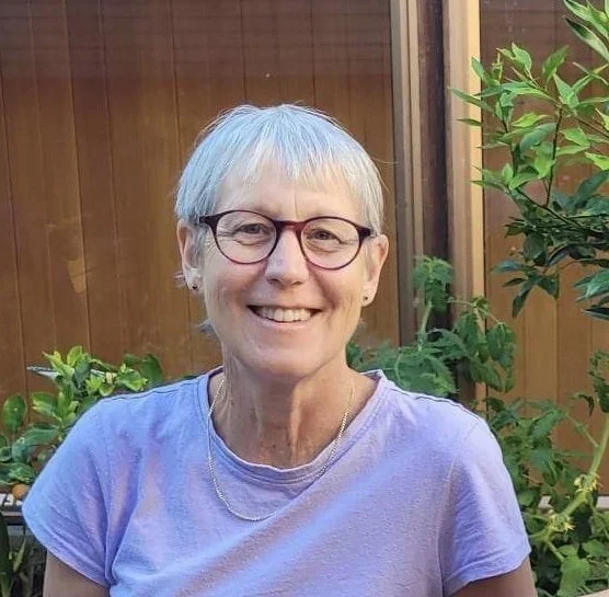 Smiling elderly woman with short gray hair, glasses, and a light purple shirt standing outdoors in front of a wooden fence and green plants.