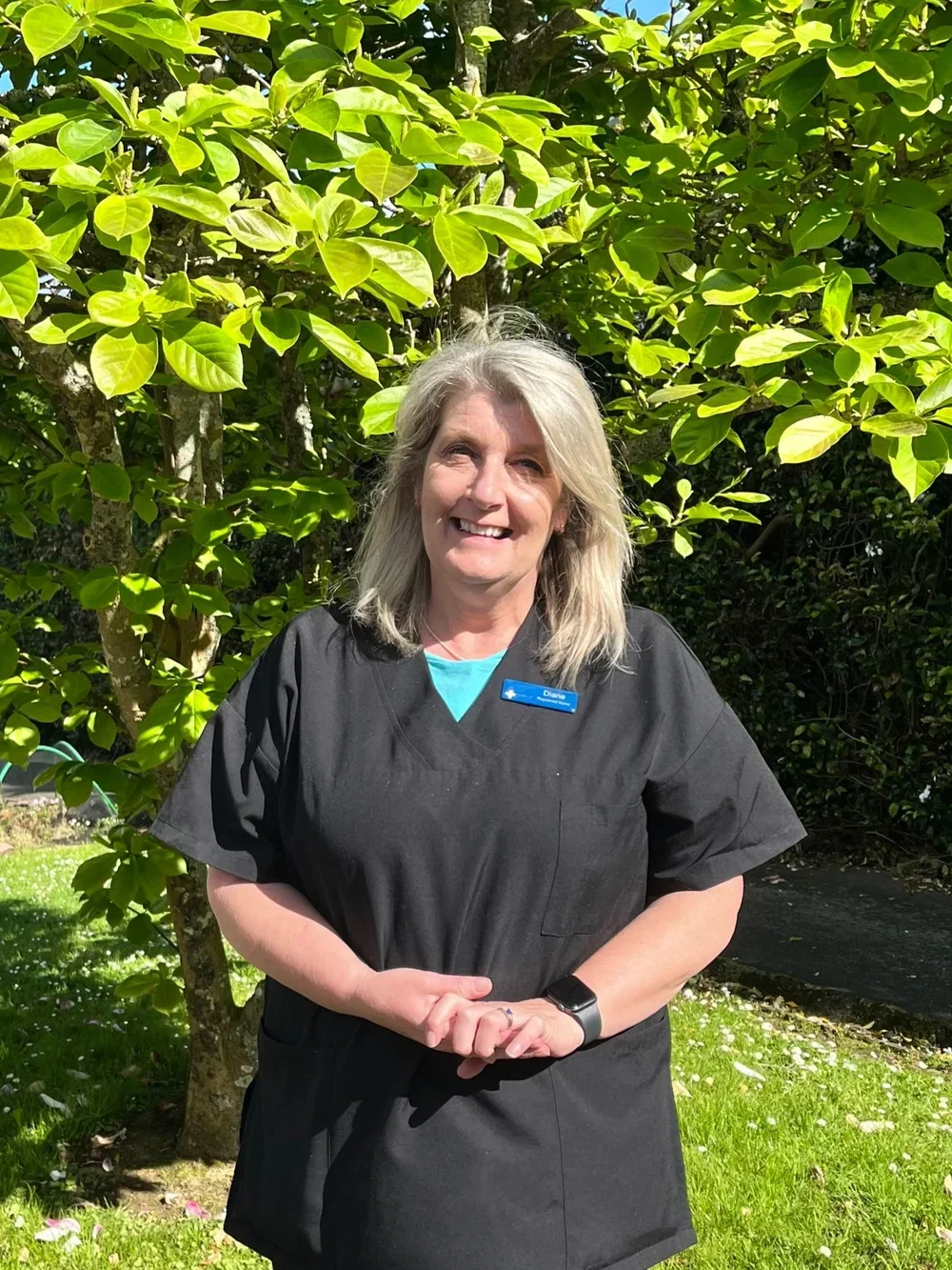 A woman with gray hair smiling outdoors in front of green leafy trees, wearing black scrubs with a blue name tag.