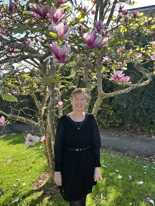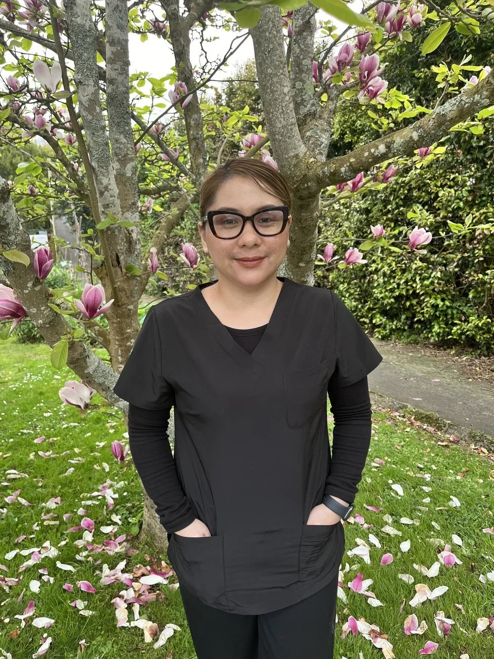A woman with short brown hair, wearing black glasses, a black scrub top and pants, standing outdoors in front of a flowering tree with pink and white blossoms. She is smiling and has her hands in her pockets, with a grassy area and path in the background.