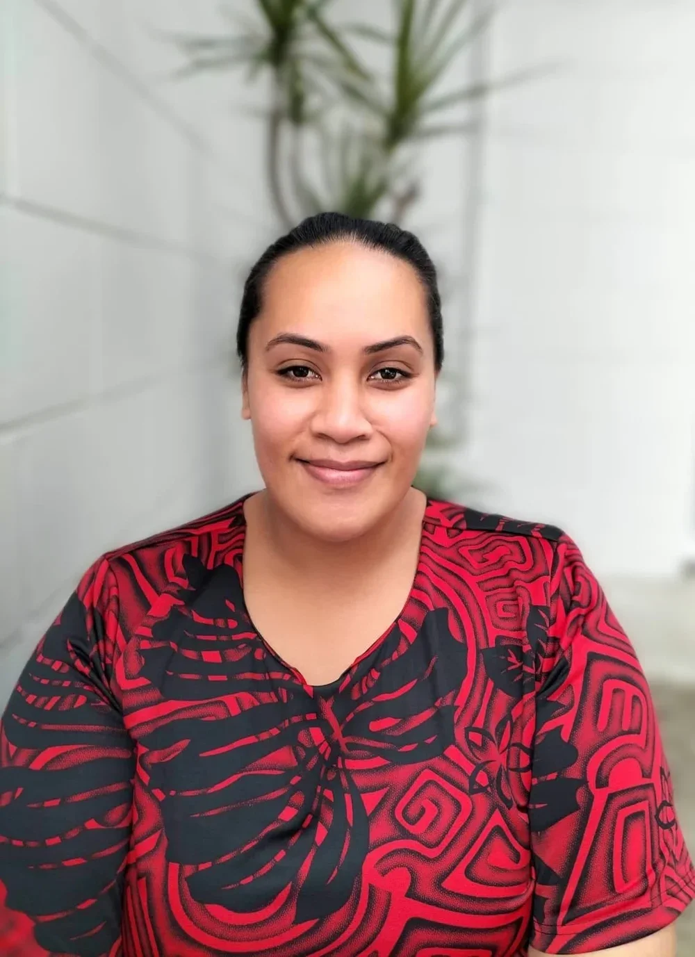 A woman with dark hair pulled back, smiling, wearing a red and black patterned top, sitting indoors near a wall and a tall green plant in the background.