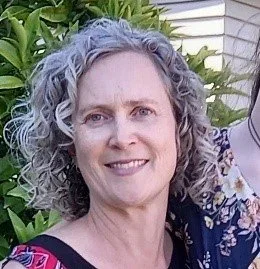 A woman with curly gray hair smiling outdoors with green foliage in the background.