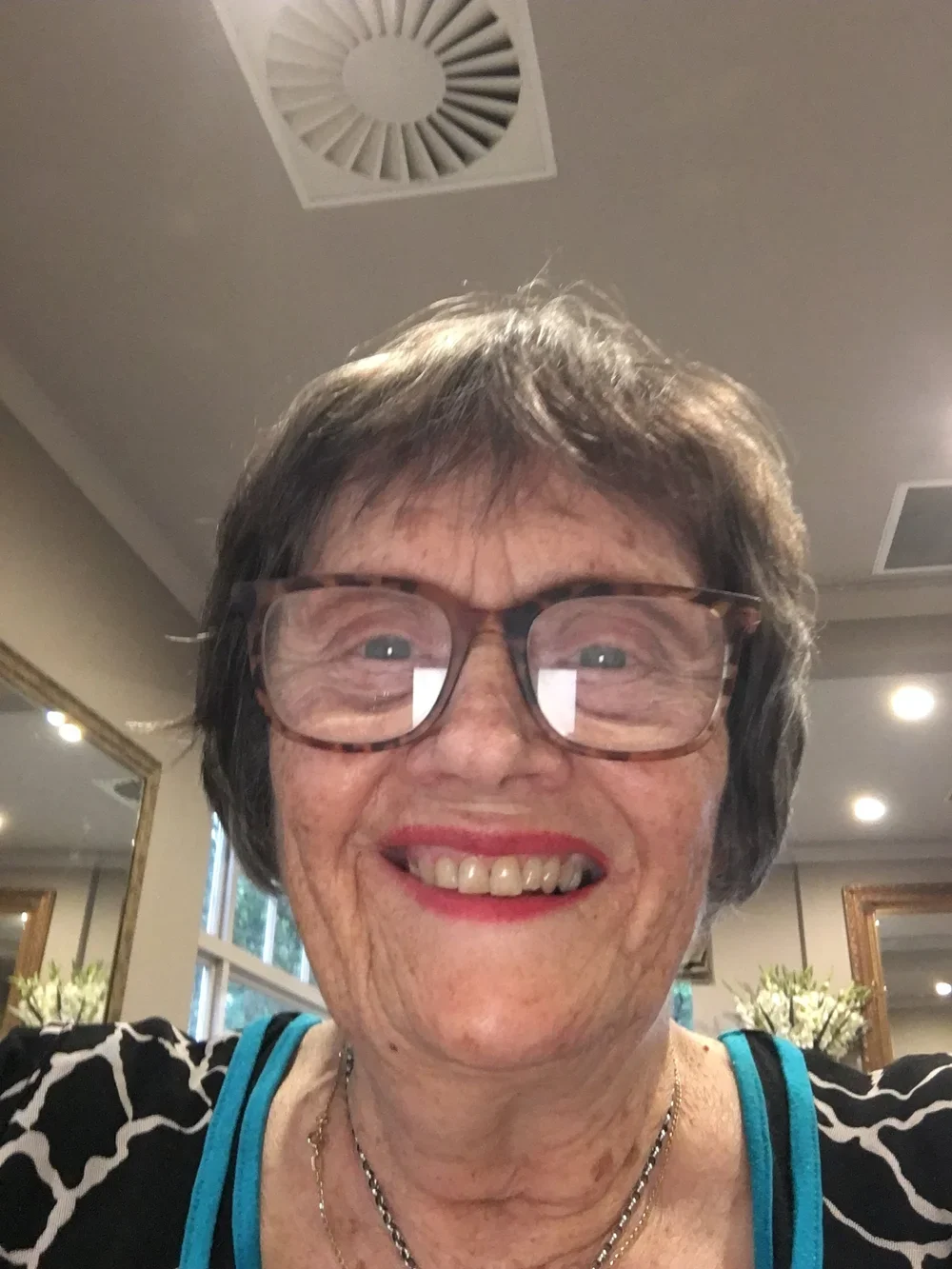 A smiling elderly woman with short gray hair wearing large glasses, a black and white patterned top, and a silver necklace, sitting indoors with framed artworks and windows in the background.